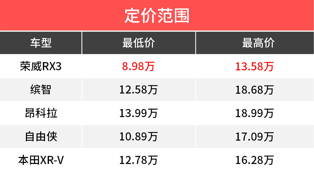 从RX3的定价范围来看,8.98-13.58万的价位范围恰好就是国产车型与合资车型抢夺客户的“交战区”。那么在这个定价范围内,既能保持与拼颜值、拼配置的国产SUV市场进行竞争,又能够与市面上较为热门的主流合资SUV进行抢夺客户,相反14万的价格也只能买到低配的XR-V、缤智、昂科拉、自由侠等合资SUV,所以未来荣威RX3的销量表现还是非常值得期待的。