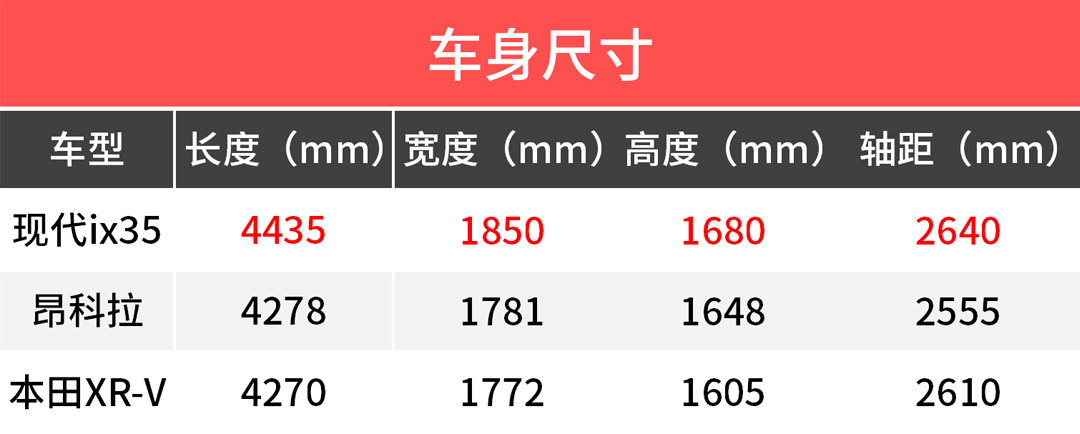 旧款车型已经三年不更新换代,显然在车身尺寸上已经跟不上市场较为热门的SUV,而新款的ix35车身尺寸除了轴距以外,长宽高的数据都有所提高,与本田XR-V、昂科拉相比都大了不少,相对形成了属于自己的独特优势。