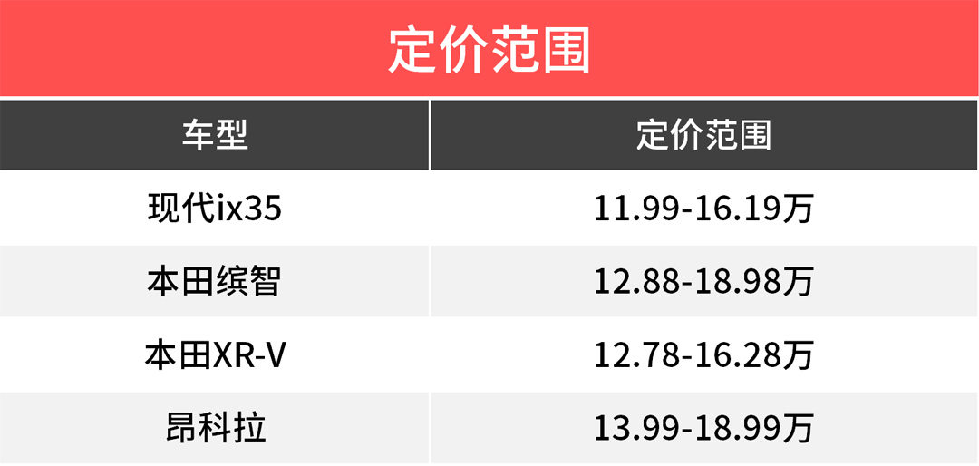 在定价方面,新款ix35的价格范围为:11.99-16.19万,相对于老款而言,顶配车型的价格有所降低,看起来更让消费者觉得买得起!那么在这个价格范围内,消费者能够考虑价格相近的本田XR-V、缤智、昂科拉等车型,但是丰富的配置、良好的乘坐舒适性、较低的起步价格仍然是这款车的优势。
