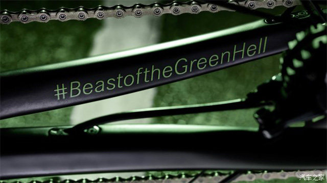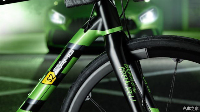 ROTWILD R.S2自行车的设计灵感源自“来自绿色地狱的猛兽”梅赛德斯-AMG GT R,炭黑色为自行车颜色主体,细节处搭配对比鲜明的哑光魔焰绿色,动感十足的同时,又与AMG GT R的车身颜色交相辉映。