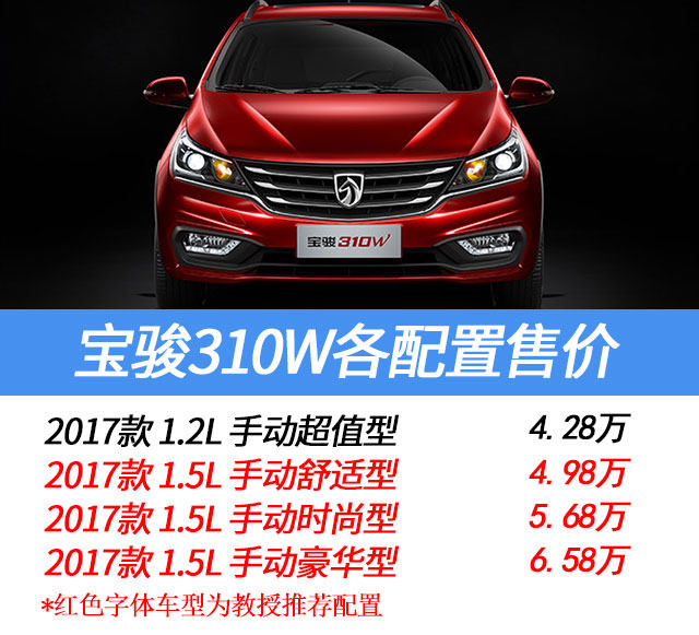总结:追求享受的话,宝骏310W中高配比较值得推荐。宝骏310W中高配在配置方面能媲美十来万的紧凑型轿车,不过对于购买宝骏的用户来说,价格会略微超过预期。宝骏310W的1.2L 手动超值是完全不值得选购的,配置极低,而且发动机无力。