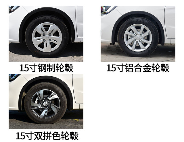 轮毂方面,宝骏310W有三款轮毂,15寸的钢制轮毂是最低配两款上配备的,15寸铝合金轮毂则是中配的配置,而双拼色轮毂是顶配才有的。