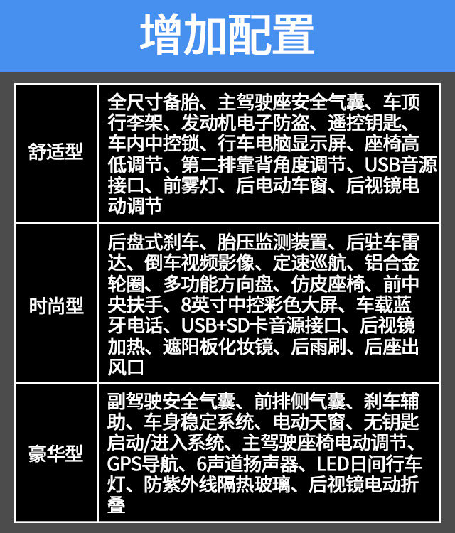 得益于低配车超低的配置,每个车型升级都看上去非常多。舒适型增加的配置属于比较基础的配置,在别的车上基本都是默认的配置。时尚型的配置升级集中在娱乐性、便利性和舒适性上。豪华型的配置升级集中在安全配置和一些便利性的配置。