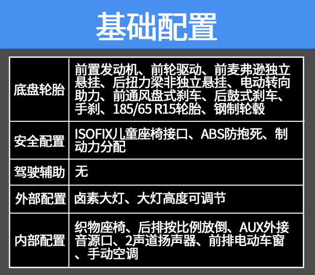 舒适型的配置赶得上别家的最低配,我觉得这个配置最大的优点就是价格便宜,别的也没什么了。