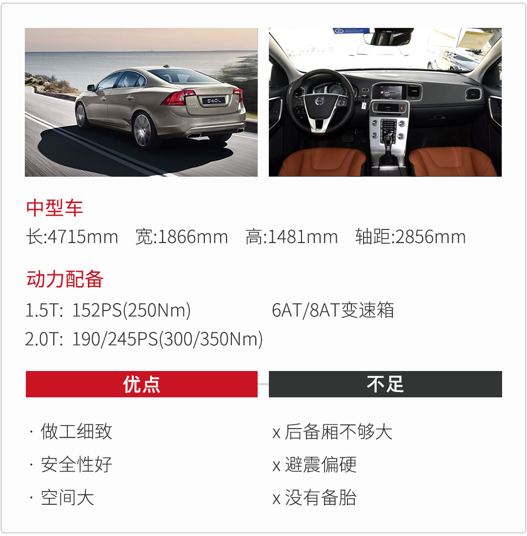 沃尔沃可以说是一个相对冷门的豪华品牌,不过其出色的安全性还是得到消费者的一致认同,沃尔沃S60L在国产之后,依然继承原厂的高水准,整车做工、安全配置、空间方面和同价位的主流豪华品牌相比也不会吃亏。沃尔沃S60L稳重大气、棱角分明的外观设计和前置前驱的驱动形式就让人感觉不是走运动路线,不过动力选择比较多,有1.5T和2.0T高低功率版本,1.5T的动力表现比较一般。沃尔沃S60L给人的感觉就是很均衡,如果问S60L有什么突出的卖点的话,无疑就是超高的安全性和舒适的驾驶感受,加长轴距后的后排空间也很可观,性价比还是不错的。
