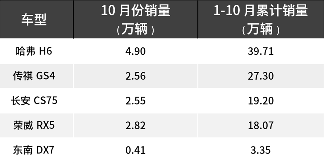 哈弗H6不愧是国民神车,牢牢占据SUV销量排行榜冠军宝座,而传祺GS4、长安CS75、荣威RX5的表现也都很不错,10月份销量均过2万,但是东南DX7的数据和上面几位对比起来显得有些单薄。