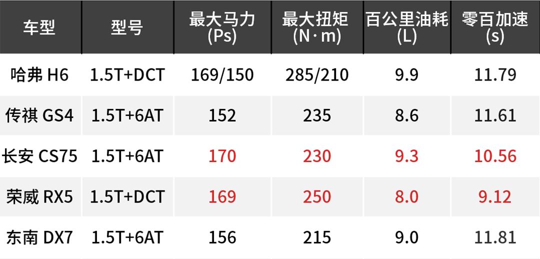 可以看出这几款自主车的油耗都不低,其中节油性表现最好的是荣威RX5,并且它的最大马力以及最大扭矩参数较为亮眼,实测0-100km/h成绩为9.12秒,油门响应积极、传动效率较高。