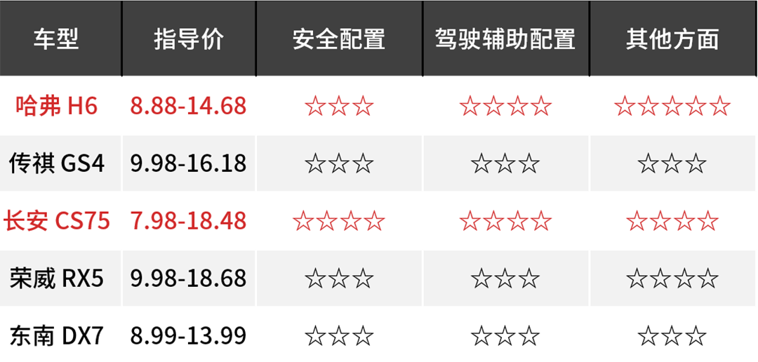 长安CS75的入门价格最低,但是乞丐版车型没有车身稳定控制,而哈弗H6做到了全系标配,不过长安CS75的顶配版车型带有车道偏离预警系统与主动刹车系统,这在同级中是绝无仅有的。