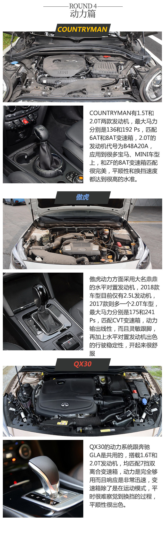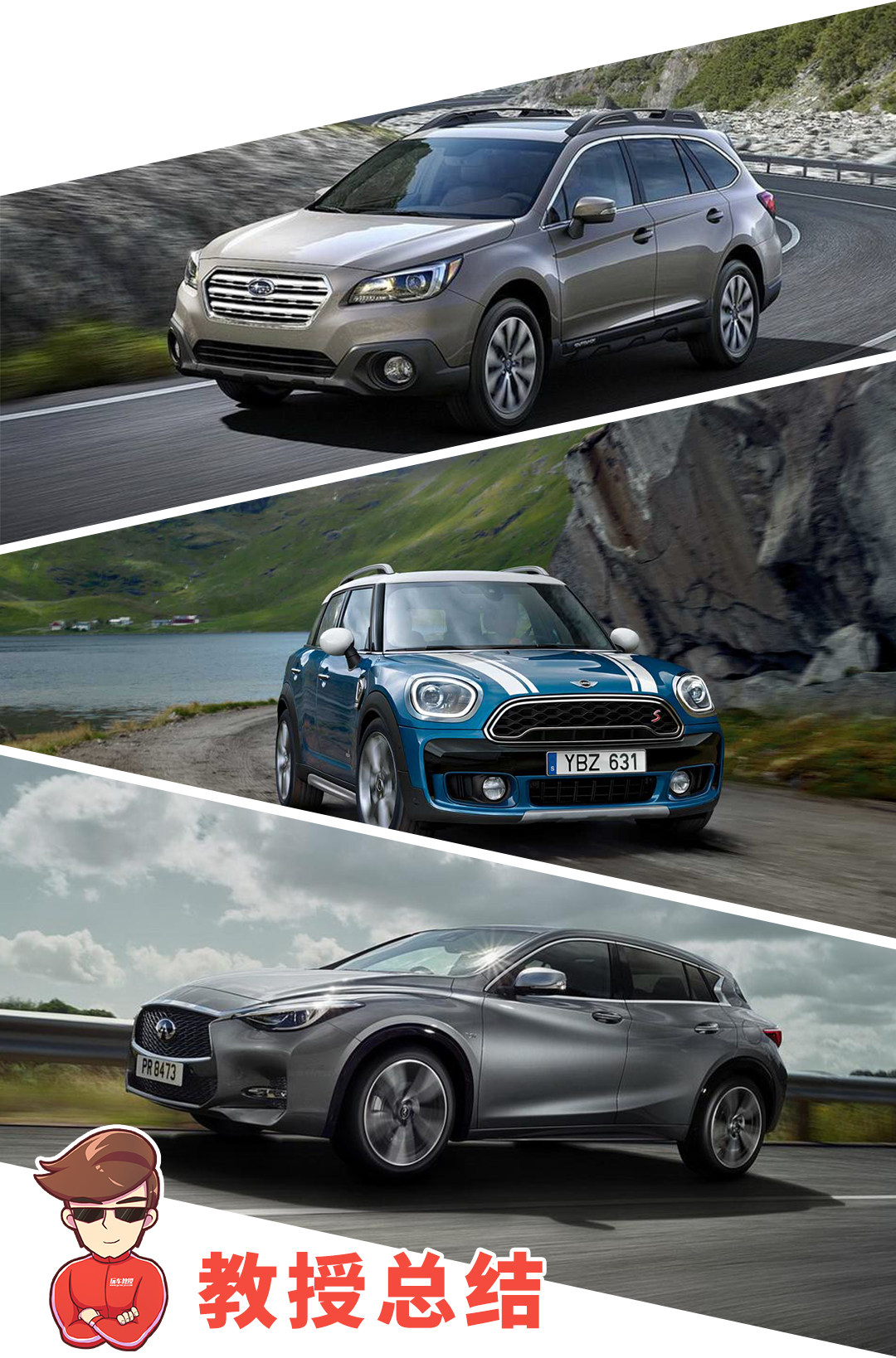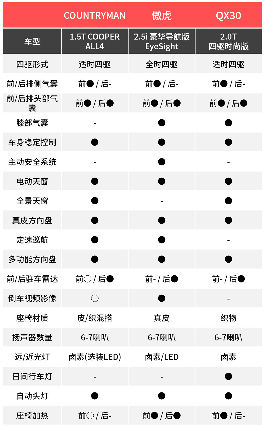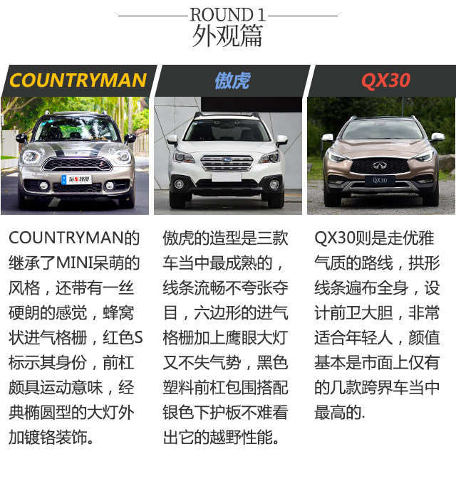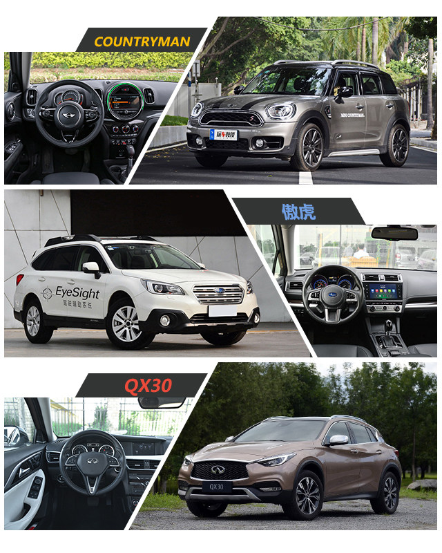 推荐的几款都是比较独特的车型,COUNTRYMAN和QX30则比较适合年轻人,两个风格,前者活泼可爱后者优雅端庄,不仅有个性,也很适合居家使用;傲虎接近30万这个价位确实有点高,但使用水平对置发动机,全时四驱、EyeSight辅助驾驶,也是值得的。