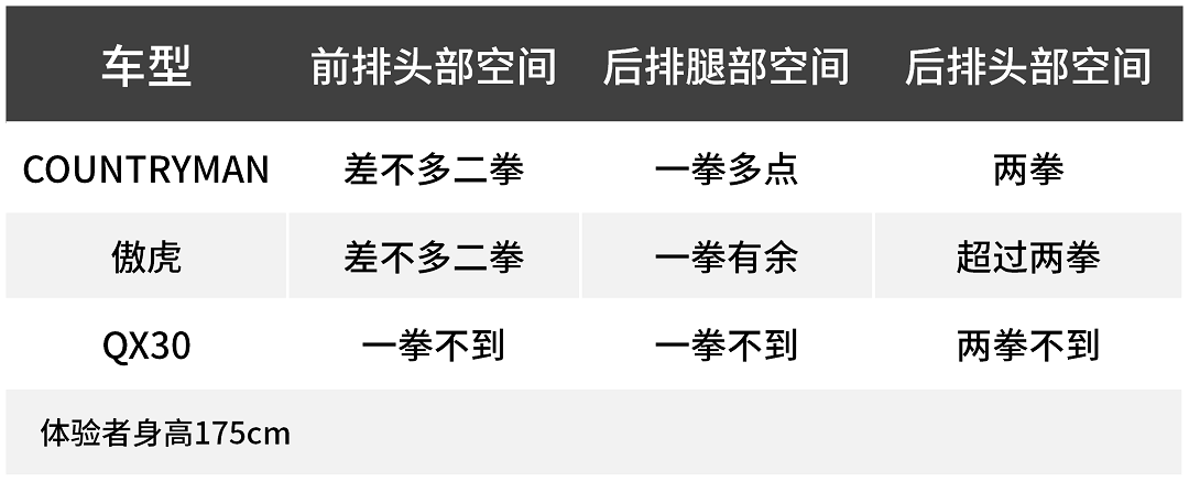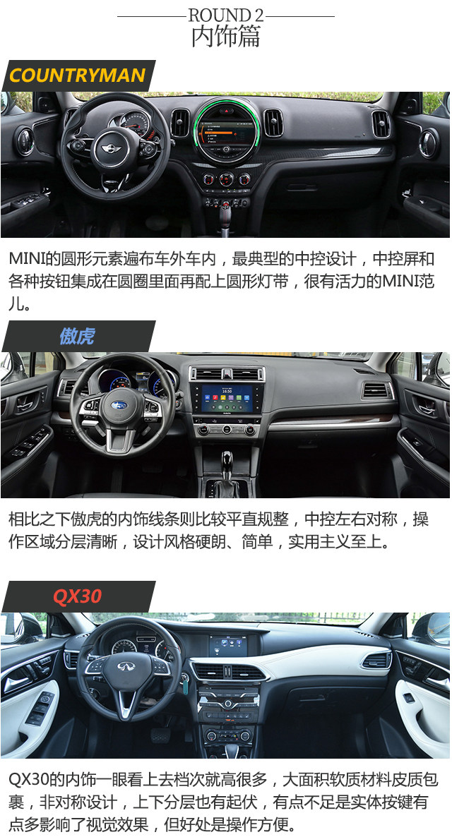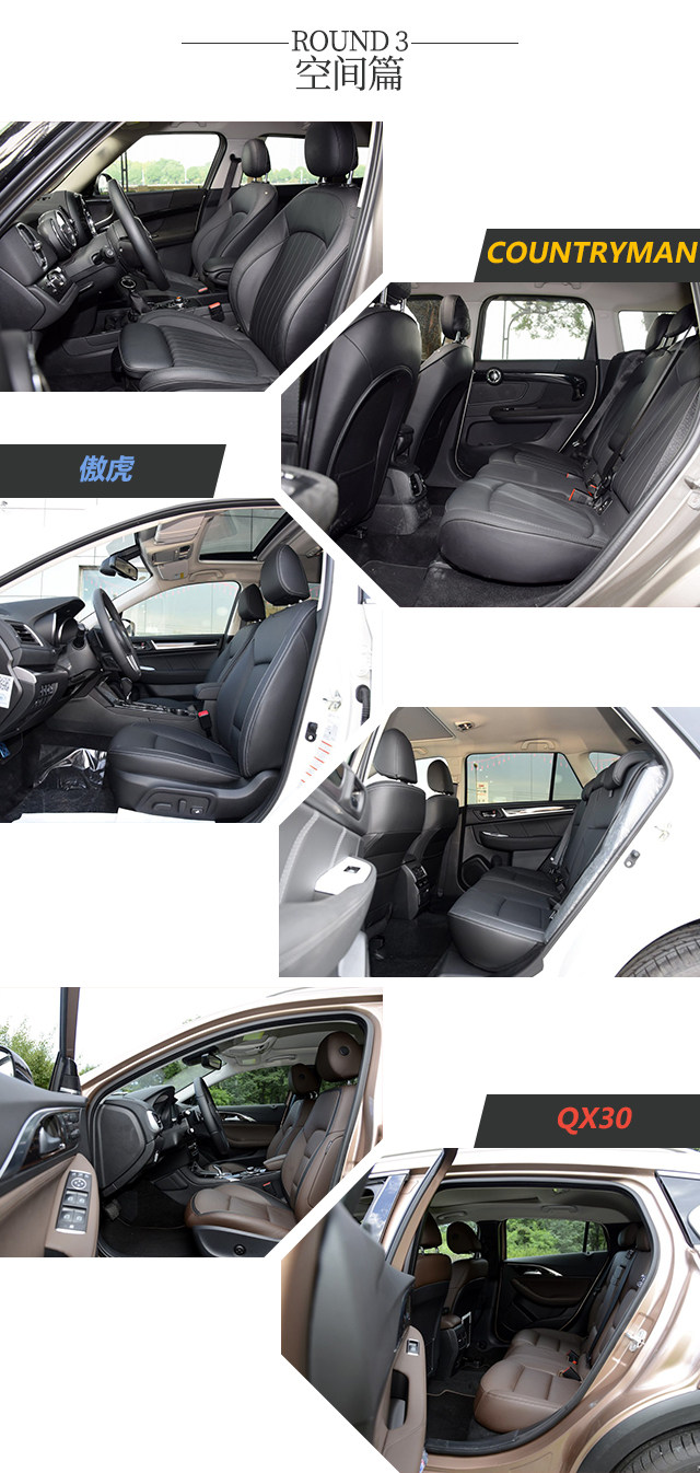 空间方面,MINI COUNTRYMAN和英菲尼迪QX30都是紧凑型SUV,空间表现没有中型SUV的傲虎这么好,但是COUNTRYMAN值得点赞,因为其低矮的车身,头部空间都很充裕,后排的腿部空间也够用,而QX30则稍逊一筹,身材高大一点的人可能会觉得有点拥挤,傲虎表现中规中矩,比较符合中型SUV的水准。