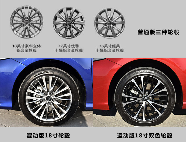 全新凯美瑞可以分为普通版、混动版以及运动版。普通版车型提供5种基础颜色可以选择,混动版多出一个独享的海钻蓝颜色,而运动版则是多出两个十分个性的双色车身颜色可以选择。轮毂方面,普通版车型由高到低有三种轮毂,精英版和领先版使用16寸轮毂,2.0豪华版使用17寸轮毂,2.5豪华版和旗舰版使用18寸轮毂。而混动版和运动版则是各有自己独享的18寸轮毂。
