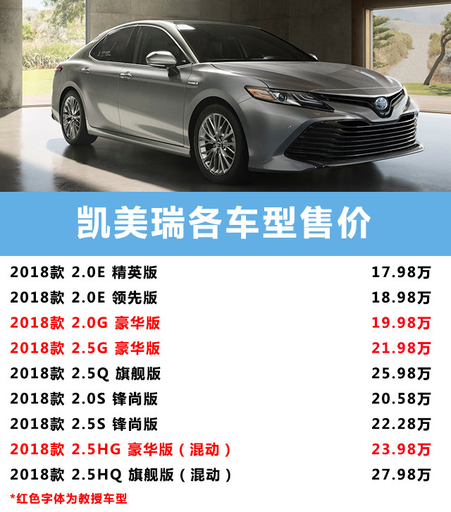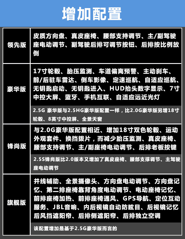 全新凯美瑞虽然标配的一些配置还挺厚道的,如LED大灯、自动空调等,但其他的实用性配置却没有,领先型比最低配贵了一万,增加的配置都还挺实用的,但是太少了,性价比不高。而豪华版再贵了一万,增加的配置就多多了,除了无钥匙进入及启动、蓝牙、倒车雷达和倒车影像的十分必要的实用配置,还有自适应巡航和主动安全安全配置,轮毂也大了。所以更加推荐2.0G 豪华版,而2.5G 豪华版配置和2.0版本基本一致,换了有着41%热效率的2.5L发动机,还有18寸大轮毂和全景天窗,同样值得五星推荐。