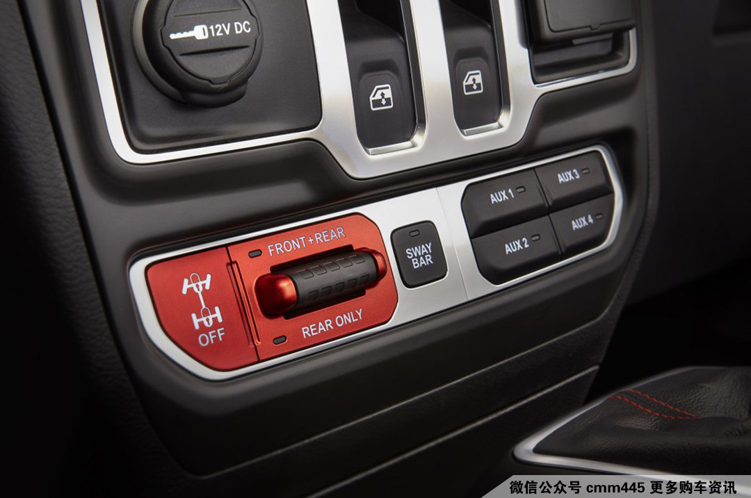 在中控台还有很多让你觉得惊奇的设计以及配置,例如理应放在车门上的车窗按钮,这是考虑到主驾驶车门拆卸后的场景使用。此外还有差速器锁拨杆,红橙色的配色相当惹人注意。旁边的是“SWAY BAR”按钮,也就是断开悬架平衡杆,实现更长的悬架行程。