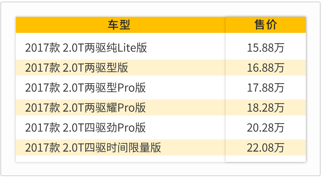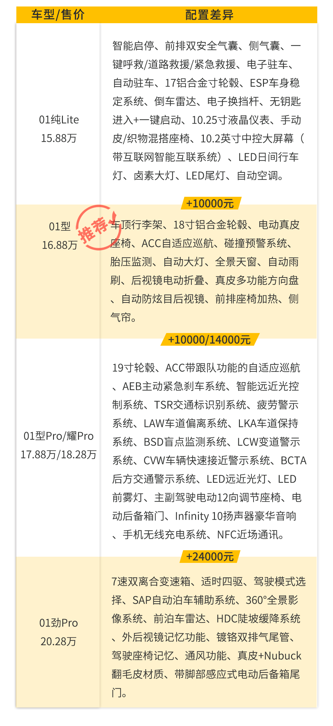 在配置方面即便是低配依然丰富,而像01PRO与耀Pro这些其实在配置方面是一样的,两车的区别在于耀Pro是车系中唯一一款采用蓝色外观、蓝白拼色的内饰的版本,所以是否愿意加4000元,这就得见仁见智了;同样,时间限量版其实也和劲Pro的配置一样,只是外观内饰细节姐方面有所不同,并且加入了更多独特的标识,每月限量200辆,还是那句,究竟要不要多加钱选择特别版?见仁见智!