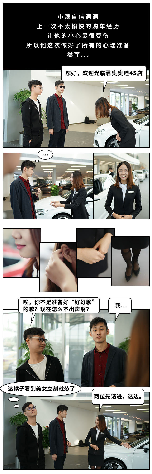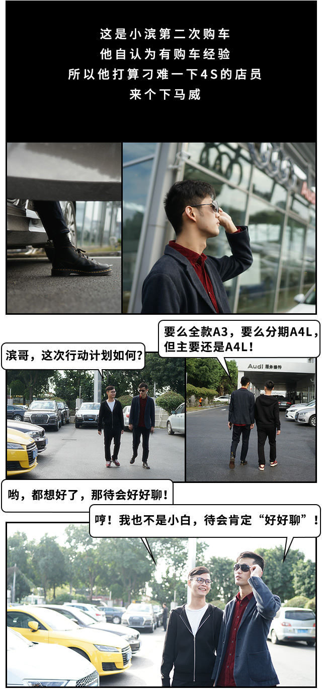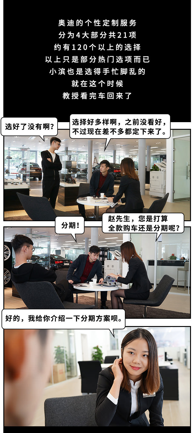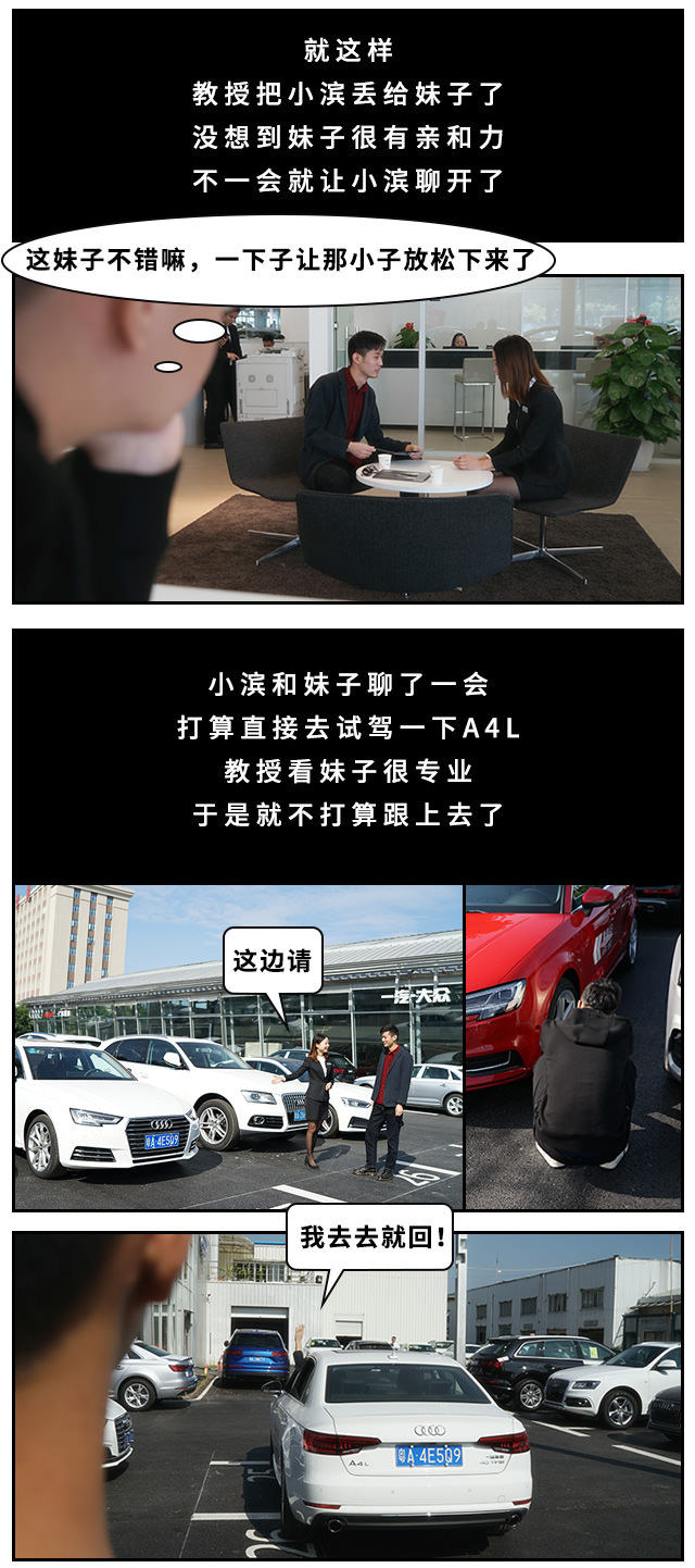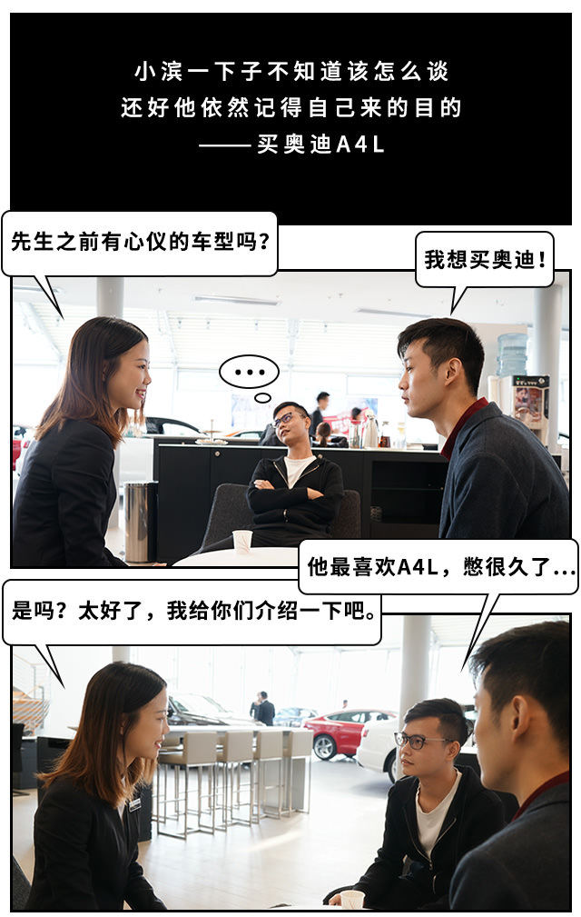 小滨是个年轻有为的平面设计师,出来工作多年后打算换车,对于线条特别敏感的他对奥迪车型情有独钟,而且也看上了奥迪A4L车型。这次由教授带他去4S店看车,如果洽谈成功打算马上订车。教授作为拥有专业汽车知识的人,同时还是奥迪的老客户,对这次洽谈同样非常期待。