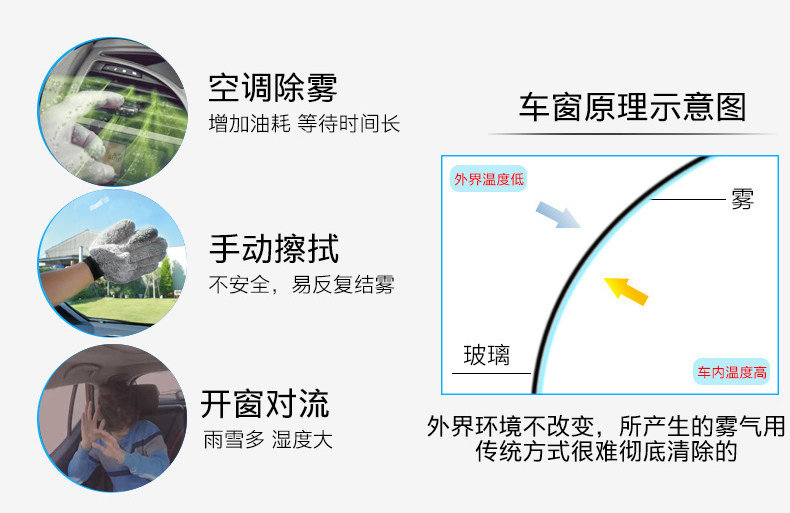 汽车产生雾气虽然不是什么大毛病,但却是个非常烦人的问题,直接影响到我们的驾车视线还有驾驶心情。用防雾剂的好处就在于你只要施工一次就可以维持个把月,非常省心,不用每天开车先去清理雾气。