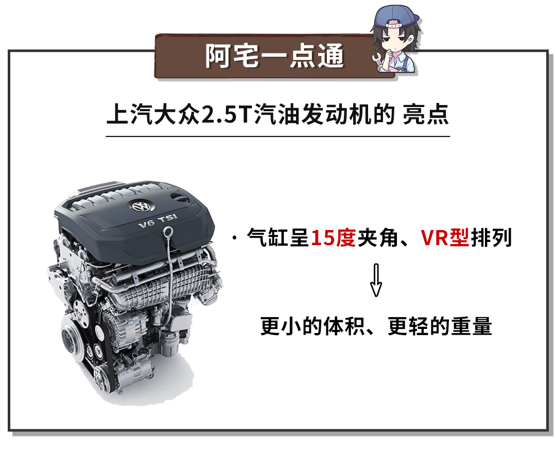 这款搭载在途昂身上的EA390 2.5T 涡轮增压发动机最大的亮点就是利用了有别于传统的VR型夹角排列(气缸呈15度夹角),如此紧凑的结构,使得占用空间小,布局灵活性颇高。就算是体型巨大的途昂也hold得住,220kW/6000rpm的最大功率,500Nm/2750-3500rpm的峰值扭矩,整车百公里加速仅为6.9秒,最佳发动机非它莫属。