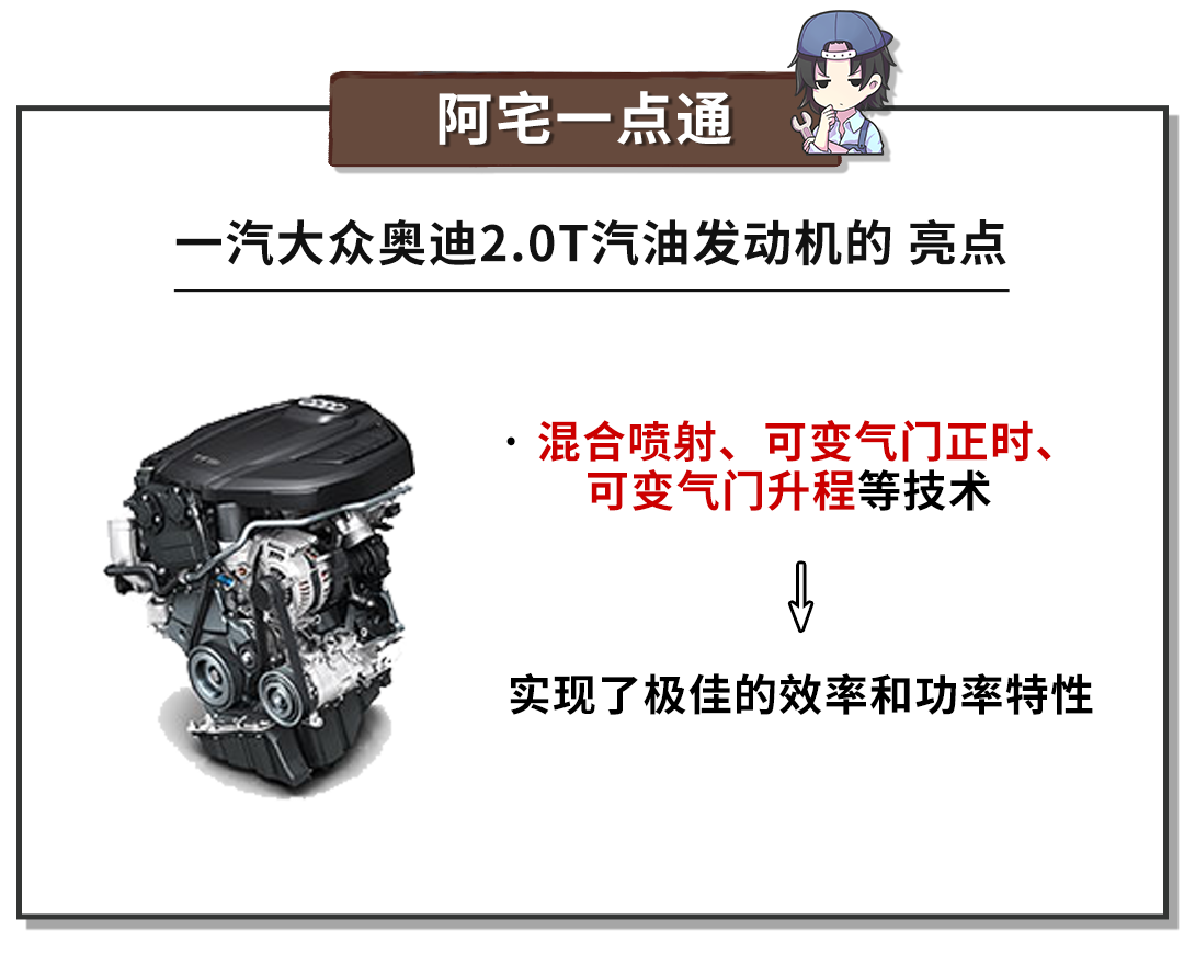 而搭载在奥迪A4L身上的2.0T发动机采用了混合喷射的供油方式。低负荷工况时,有小排量发动机省油的优点;在高负荷时,又有大排量发动机的优点。再搭配多项创新技术,使得油耗、效率都有不错的表现。