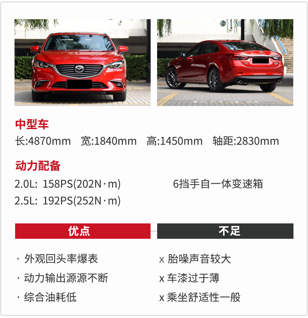 尽管不少已经购买了阿特兹的车主都有反应车内的隔音效果差的缺点,但是高回头率的外观以及平顺的动力输出的确能够让驾驶者忘掉这些不足的地方。值得一提的是,采用了“创驰蓝天技术”以后,整体车的动力参数表现出色且获得非常好的燃油经济性。如果硬是需要在阿特兹这款车上找出一个不足的地方,那么一定是没有配备时下流行的全景天窗。