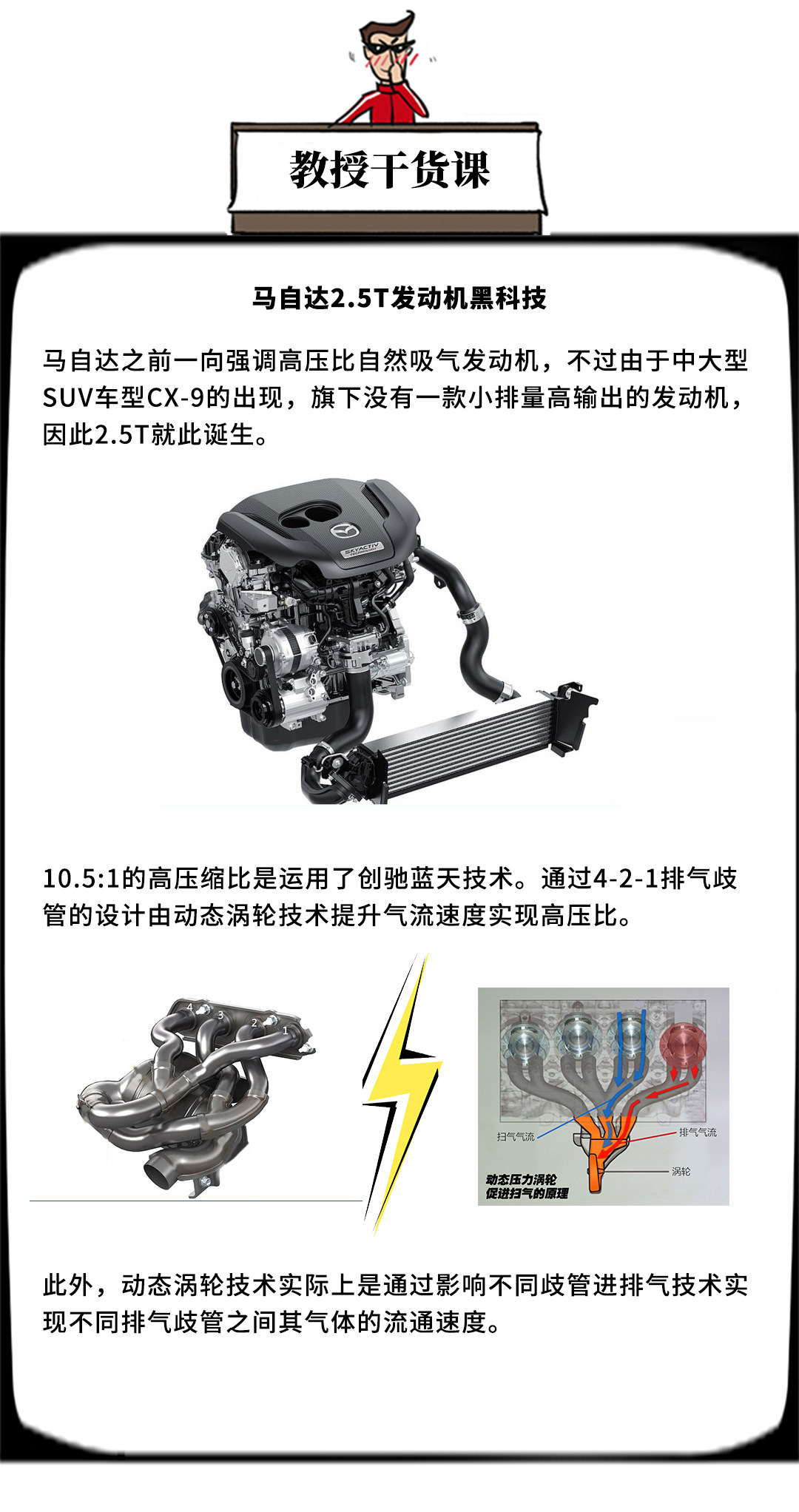 现款马自达六的创驰蓝天技术发动机已经足够出色,但全新马六则进行了全面升级。例如全新的2.5L创驰蓝天技术发动机将会具备可变缸技术,在低工况时候关闭其中两个气缸,提升它的燃油经济性。其次最值得一提的是全新马自达6将会搭载现款CX-9应用的2.5T直喷涡轮发动机。据说这台发动机能做到很高动力输出同时还能做到低油耗。具体有哪些黑科技呢?
