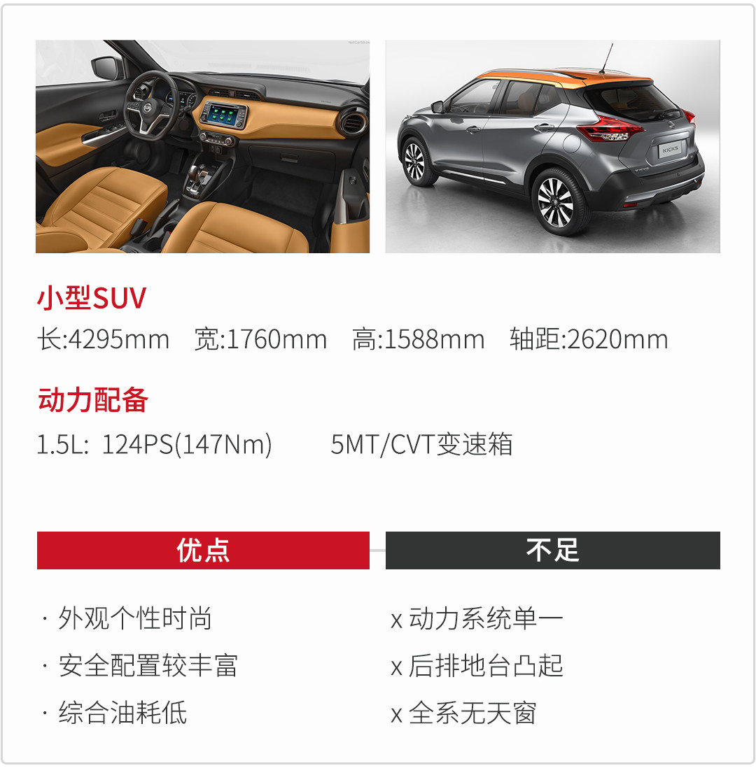 前脸采用日产家族式的“V-Motion”设计,V型的镀铬装饰条与黑色的进气格栅搭配,显得年轻动感。车身侧面线条富有力量感,采用悬浮式车顶设计,并且车顶与车身采用不同的颜色搭配,显得个性十足。车尾处则多采用不规则的线条来增加层次感。内饰设计则比较简洁,采用三辐式平底方向盘设计,中控屏多媒体系统支持苹果CarPlay功能,通过Nissan Connect系统则可以实现安卓手机的连接。乘坐空间表现不错,但是第二排地台凸起有些高,中间座位不适合长时间乘坐。