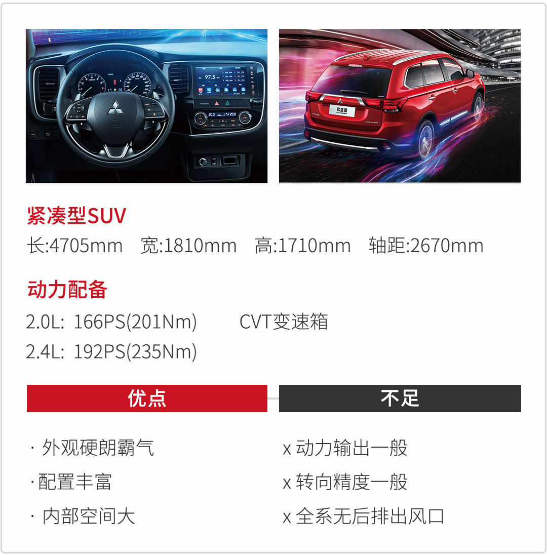 欧蓝德在前几个月进行了年代改款,主要对配置进行可一些提升。其外观给人的感受比较硬朗霸气,前脸采用大面积的镀铬装饰,搭配线条犀利的大灯,看起来颇为凌厉,侧面比较修长,欧蓝德的车身长度在同级别中算比较长的了,并且有五座和七座版本可选,车尾整体设计相比车头则比较低调,并且采用了隐藏式的排气设计。欧蓝德的内饰可能是被吐槽最多的地方了,整体设计比较简单,中控屏幕周围的钢琴漆装饰增加了一丝丝的精致感,在用料上多为硬塑料,不过方向盘上面按键的实用性还是很高的,使用很方便。在乘坐空间方面,得益于较长的车身长度和方正的外观,欧蓝德的前两排的乘坐空间还是非常可观的,七座版本的第三排只适合短途应急使用,成年人坐着还是比较难受的。