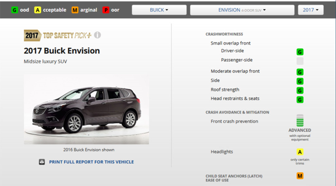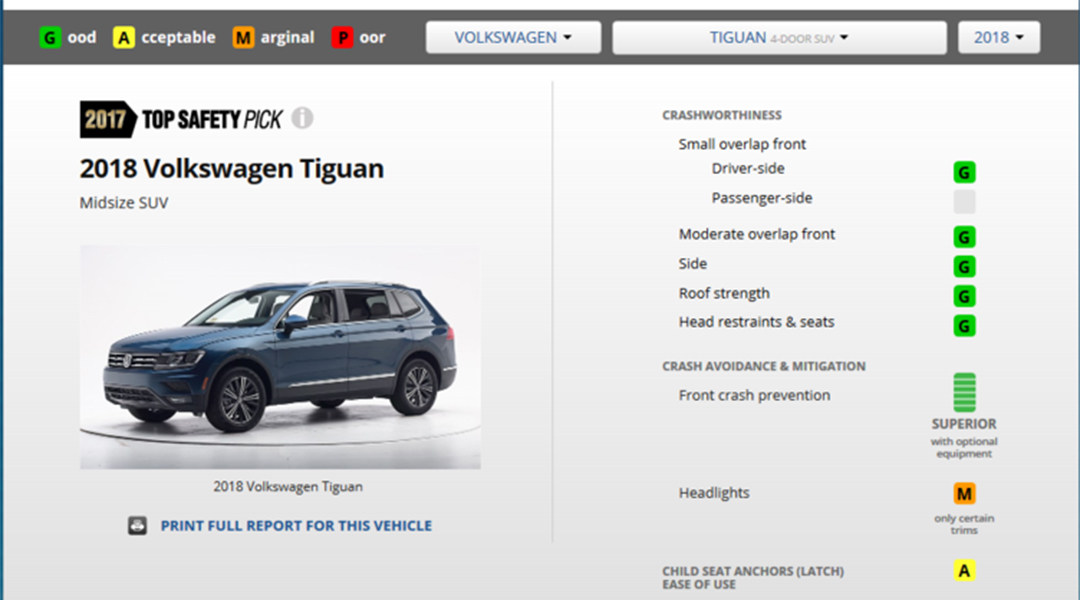 IIHS的成绩分为四个等级,分别是优秀G(Good),良好A(Acceptable),合格M(Marginal)和较差P(Poor),在这次的碰撞成绩中,测试的车型分别为2018款大众Tiguan和2017款别克Envision,对应国内的车型为途观L和昂科威。