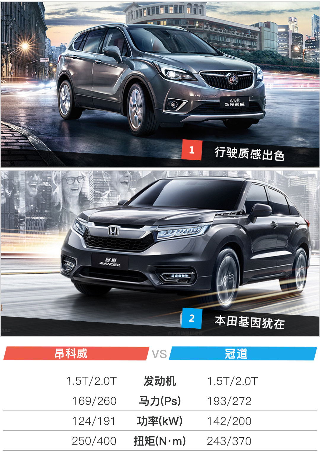 从上图可以看出,冠道的车长、宽和轴距都大幅领先昂科威,加上本田在空间方面的造诣,使得冠道有着极其夸张的后排空间。