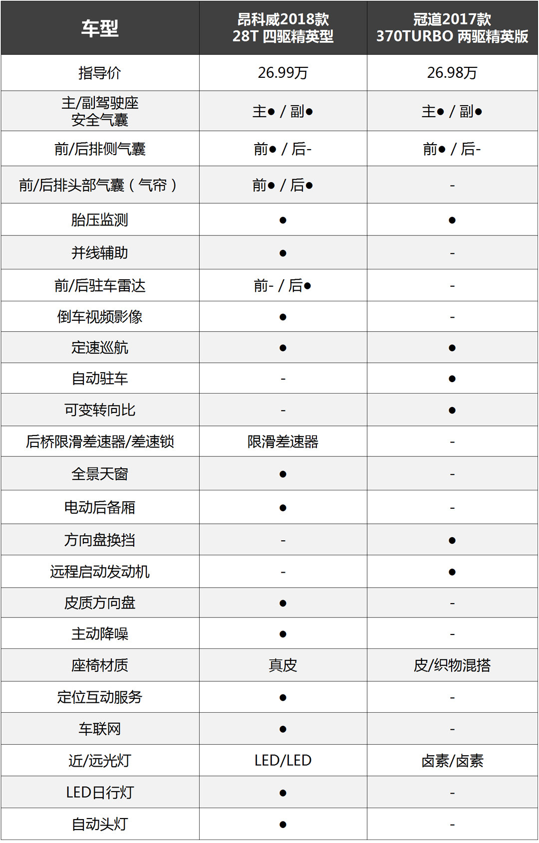 以指导价为26.99万的昂科威2018款 28T 四驱精英型和指导价为26.98万的冠道2017款 370TURBO 两驱精英版对比,差不多的价格昂科威已经可以买到四驱的车型,而且配置也够越级,比冠道多了前/后排头部气囊(气帘)、并线辅助、倒车视频影像、全景天窗、主动降噪、LED大灯、自动头灯等等,冠道只是比昂科威多了可变转向比、自动驻车、远程启动发动机、方向盘换挡拨片。此外,昂科威的市场优惠力度比较大,冠道则完全没有优惠,昂科威的性价比要比冠道高不少。
