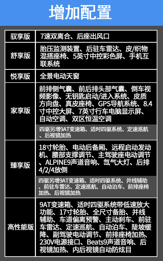 指南者提供3款轮毂,18寸轮毂是臻享版特有的,17寸高性能版轮毂是高性能版上的。剩下的配置全部是17寸轮毂