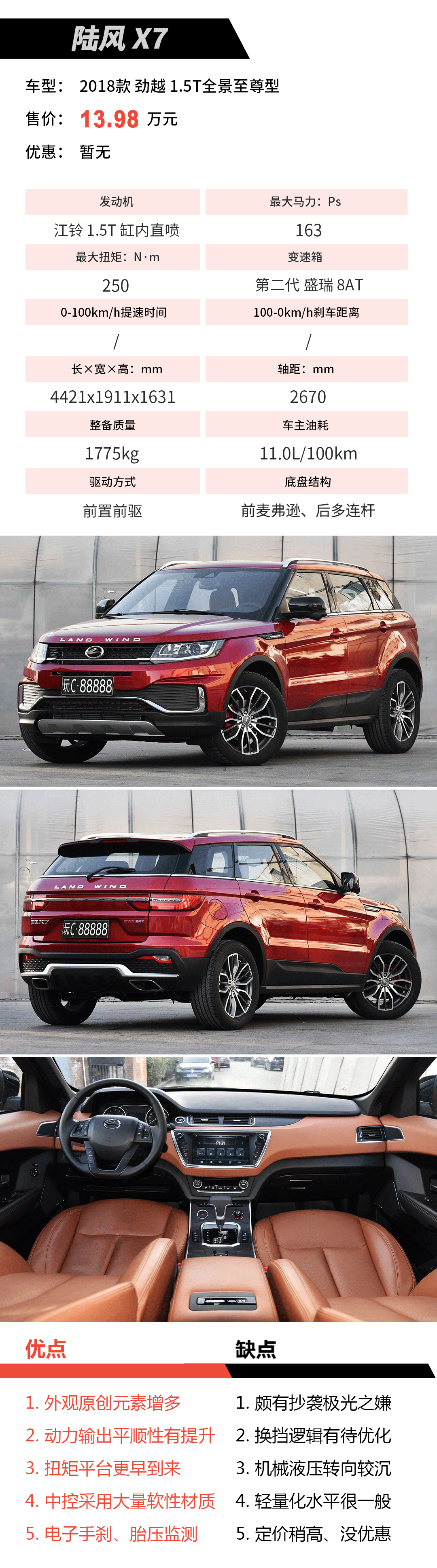 诸多原创元素加入到外观设计当中,可以看出厂商努力摆脱抄袭形象的决心,太过多的堆砌反成累赘,过于复杂、看着别扭。全系换装江铃1.5T发动机,以退为进,但拖动接近1.8吨的车重,稍显吃力。中央扶手配备的PM2.5空气净化系统尤为贴心。