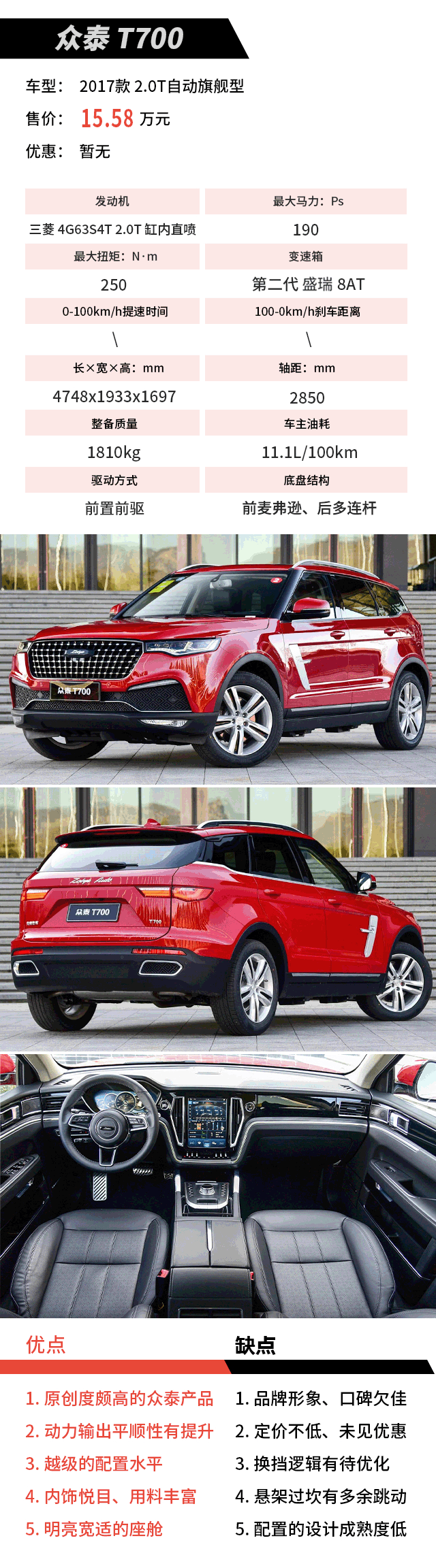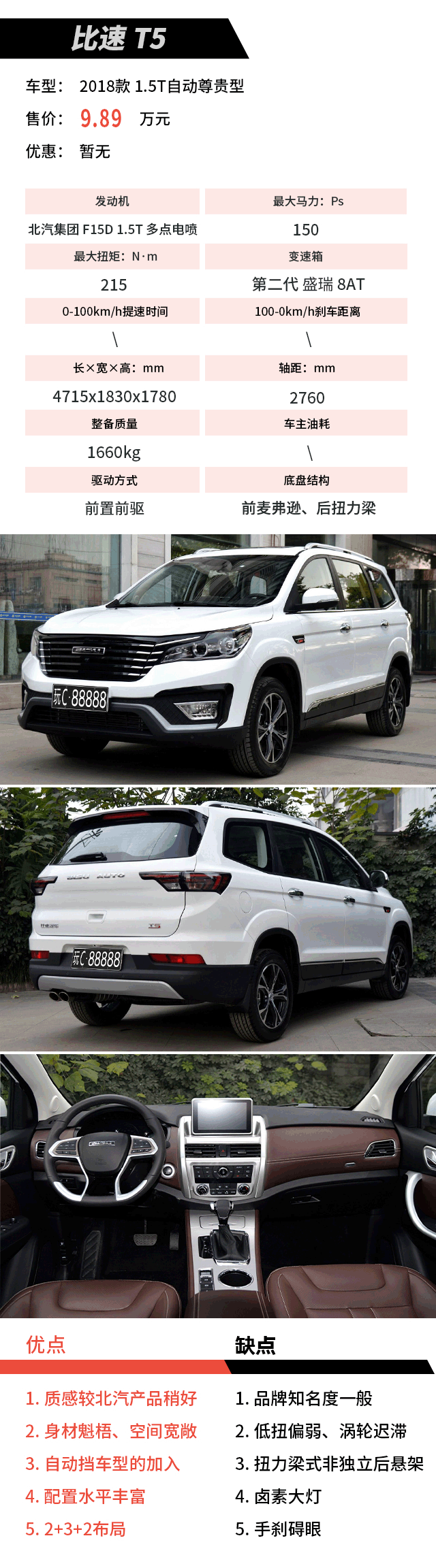 大气沉稳的外观、中庸保守的内饰,没有过人的优势,比速T5唯有以低价高配、大空间属性在竞争白热化的红海市场谋求喘息机会,动力偏弱、刹车偏软、悬架偏硬也是同价位车型常见现象,8AT的加入让其更有底气挑战长安CX70T。