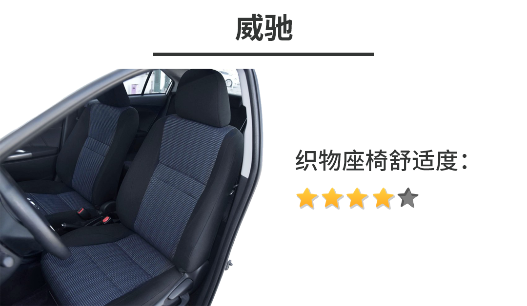 威驰是一款在小型车范畴里空间不输主流入门紧凑型车的车型,由于丰田对于空间的营造能力同样出色,所以在车内空间表现中有着比较宽敞的感觉。织物座椅比较柔软,座椅厚度尚可,不会有过于明显的单薄感受,所以乘坐起来舒适度称得上是可圈可点的类型。
