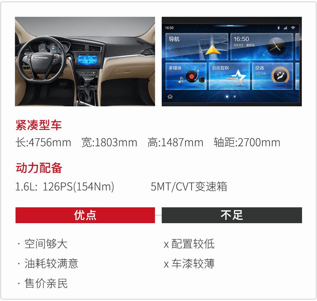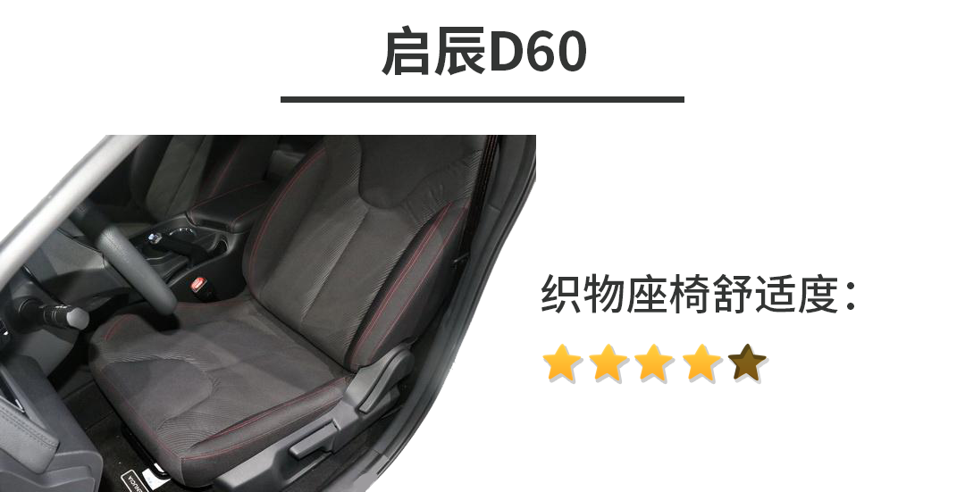 启辰D60是一款比较新的车型,带织物座椅的车型价格在6-8万左右,座椅舒适度是够够的,可惜的是启辰D60比较突出的车联网功能在这些车型上都没搭载。