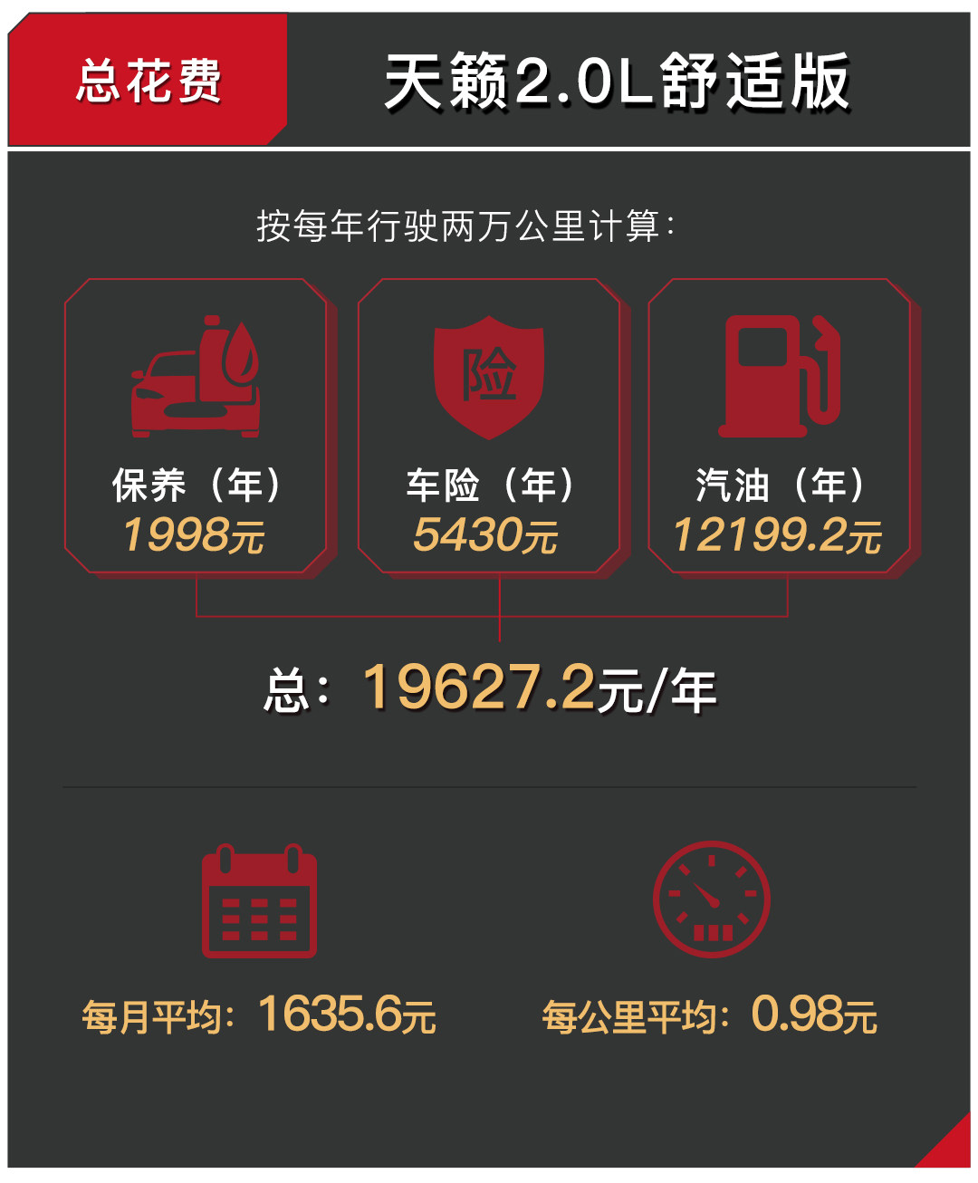 小结:无论如何便宜,天籁依然是一款中型车,虽然2.0L发动机配以CVT变速箱表现足够好,但受限于中型车的重量,油耗仍不低;一年下来的使用成本算得上中型车中非常低的一个水准,但仍比紧凑车思域要高不少。