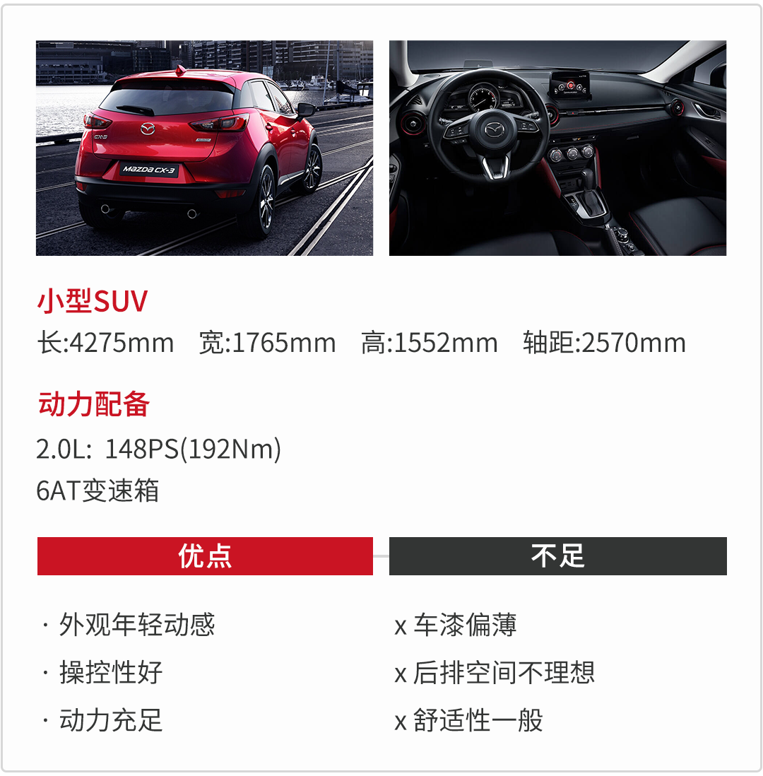 总结:以上三款小型SUV都属于较为小众的车型,但是开出去绝对不掉价,而且能给予你各种惊喜,所以不管是那些有轻度越野需求的洒脱青年,还是追求操控性、人车合一的热血青年,亦或者是追求时尚精致的小资青年,如果心动了就快快下手吧。