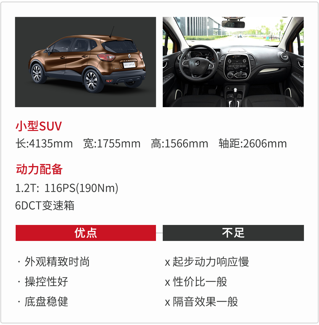 小雅最后推荐的是主打时尚个性路线的雷诺卡缤,它的外观设计具有很强的辨识度,因为新鲜感强所以回头率也是颇高的。内饰设计比较简洁,虽然中控台采用硬质材料,不过良好的装配工艺和表面的纹路处理给人不错的印象。
