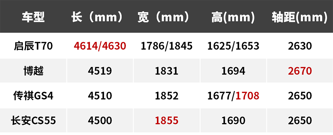 全新启辰T70长宽高分别为4614/1786/1653mm,轴距为2630mm,在尺寸上较之前更长、更宽、更高了,只是轴距并没有改变,尴尬了……