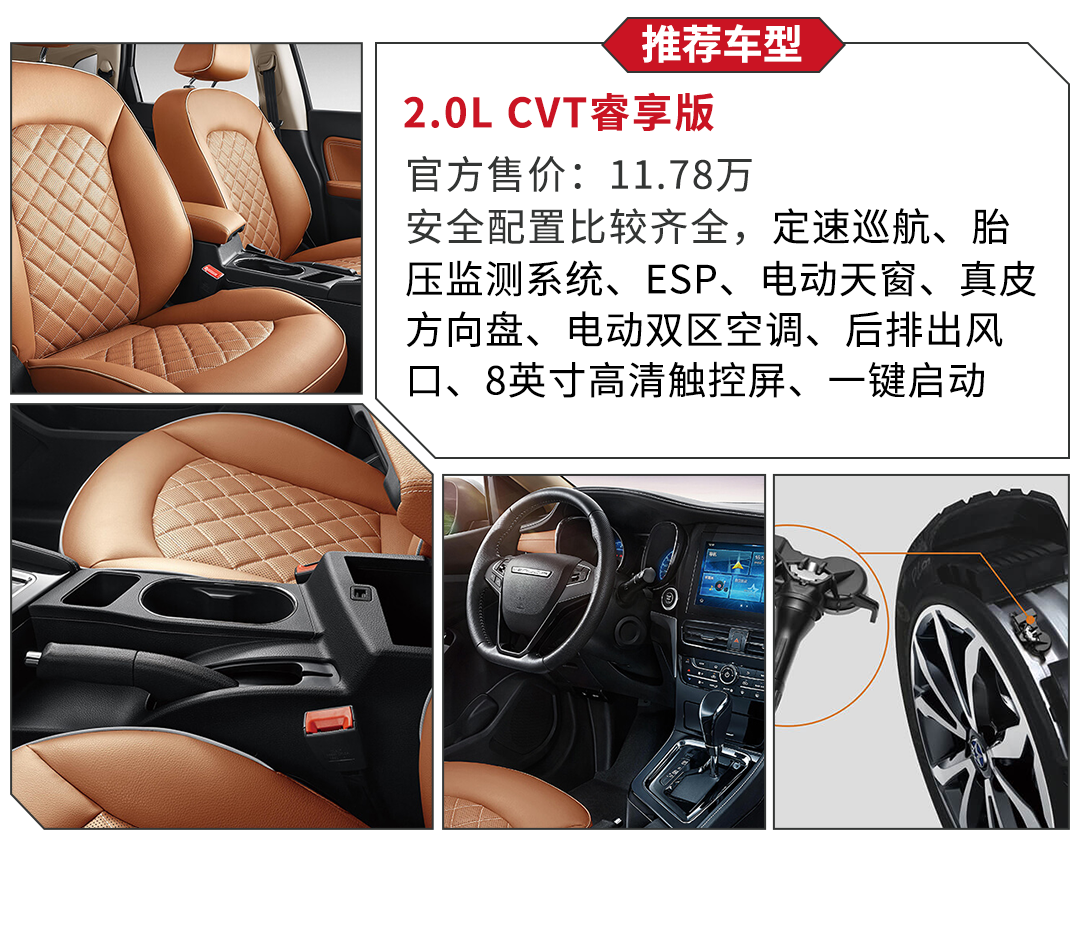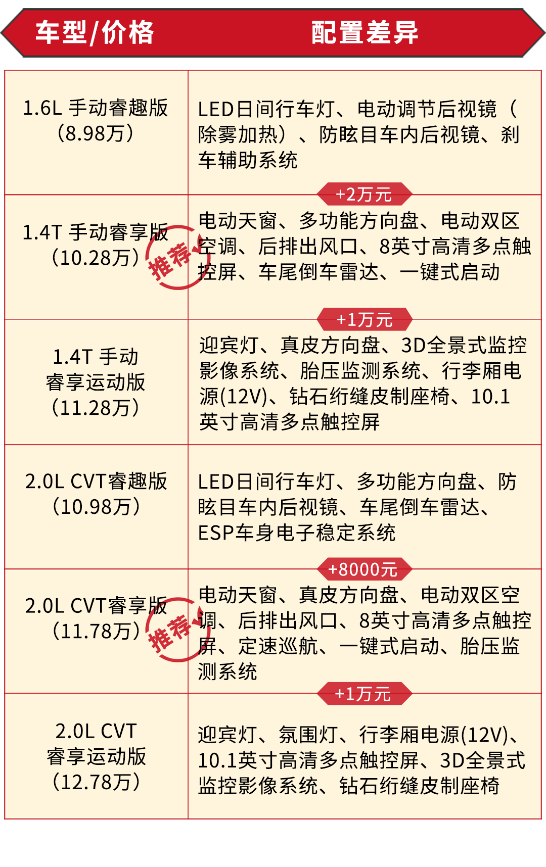 综合上面所说的,虎哥会首推2.0L CVT睿享版车型。它比起2.0L CVT睿趣版多了8000块,但是配置丰富了不少,能更好得满足日常出行需求。无论是胎压监测、倒车影像这类安全辅助配置,还是座椅电动调节、后排出风口、车联网等其他配置,都足以体现这8千元花得比较值。