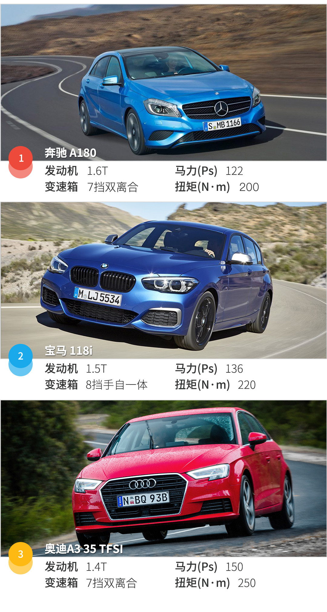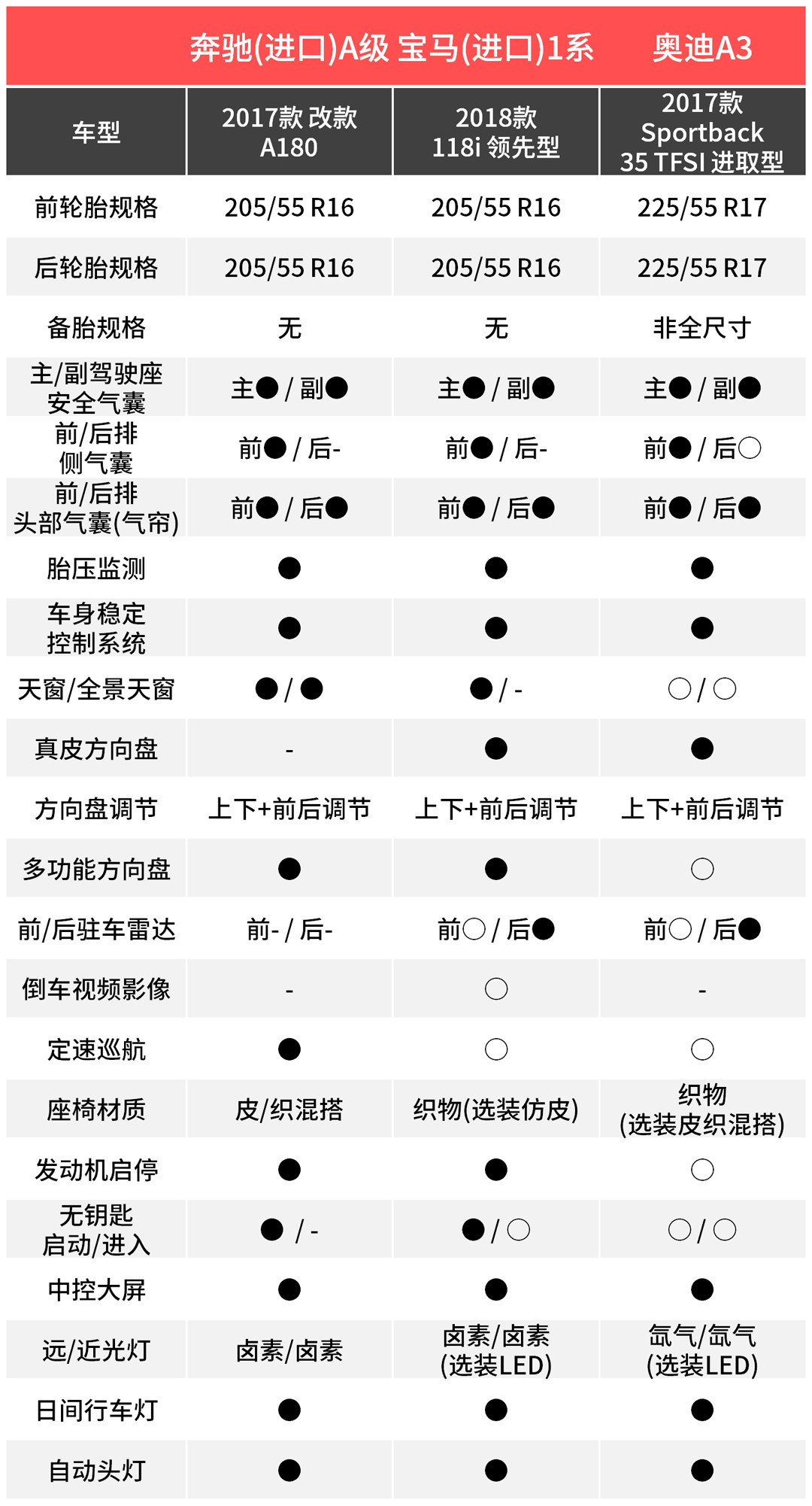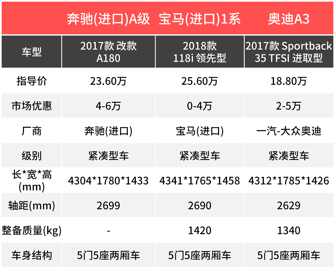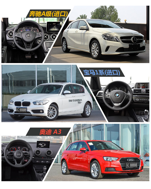 对比下来,其实很容易选,钱包够厚的话,比较推荐奔驰A180,配置充足,面子也很足,而A3性价比是比较高的,虽然是乞丐版,外观内饰一点都不丐,挣足面子,只是配置偏少一点,进口的118i,比较适合对操控有追求的朋友,价格在几款车当中是最高的,落地起码20万以上,如果不是对操控有特别要求的,新上市的国产1系更适合你。