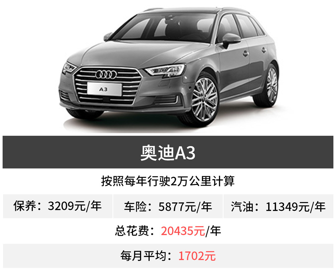 奥迪A3 的油耗表现最理想,百公里油耗在7.7L左右,保养维护费用中规中矩,一年3000出头,跟一般的合资紧凑车型水准差不多,这个是值得肯定的,所以一年下来总费用也是2万这样子,是三款车当中最低的。