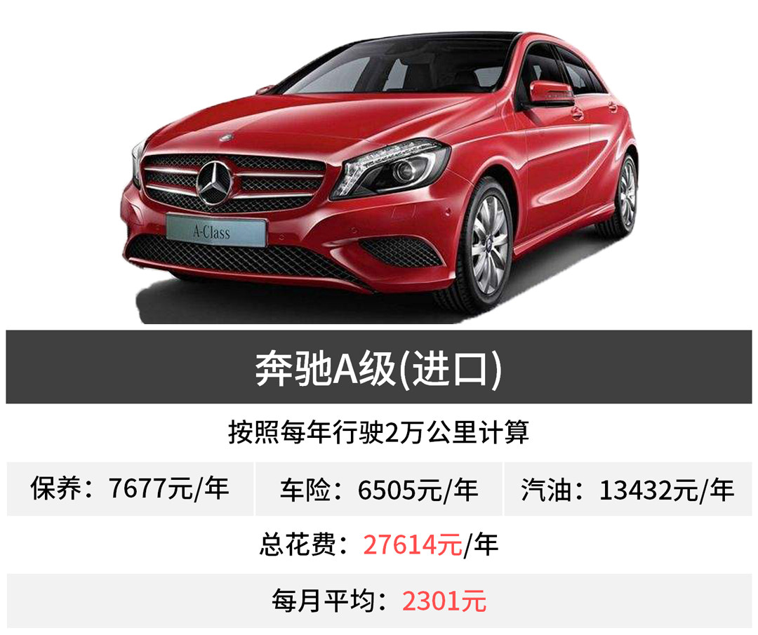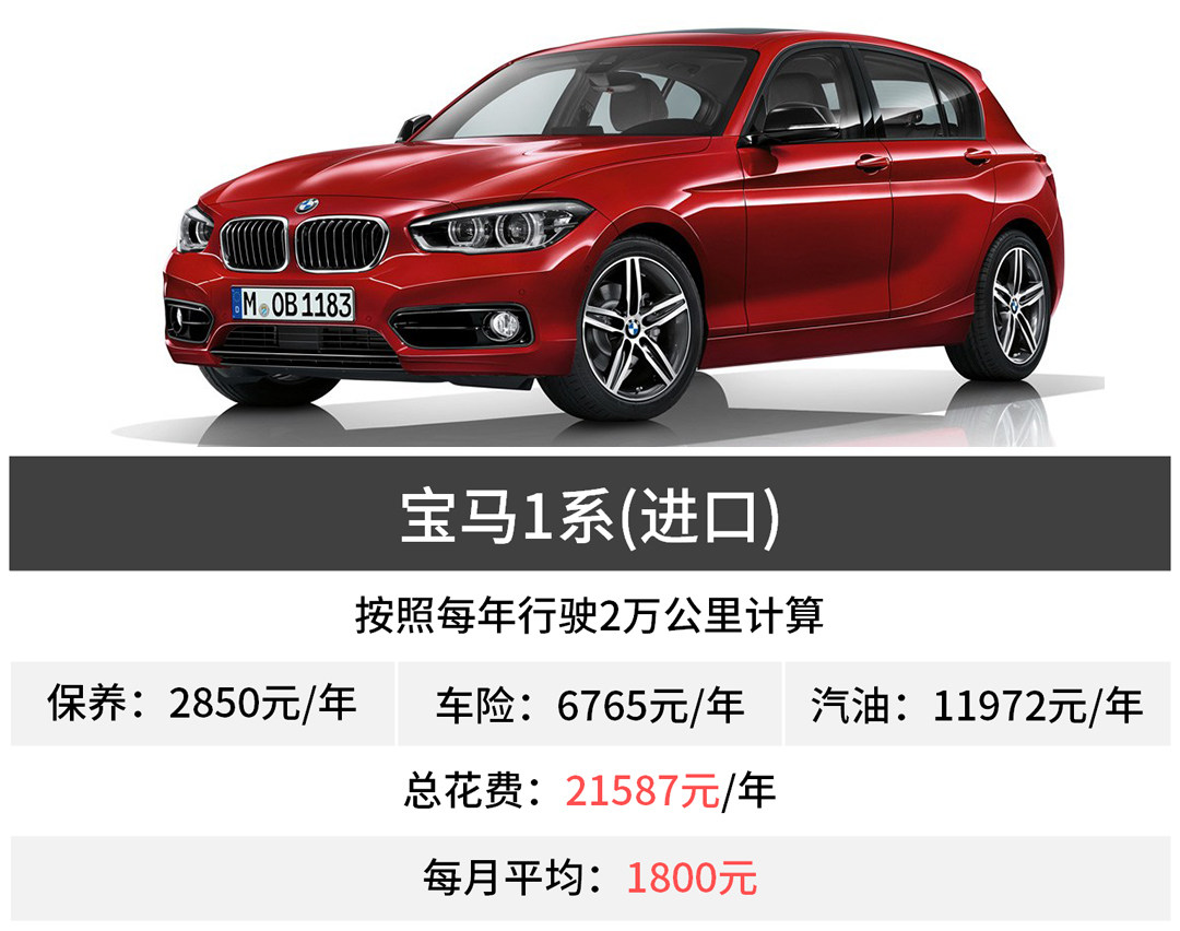 进口1系的油耗比A级好一点,在8.2L左右,一年油费就便宜了一截,再加上保养也便宜,一年的总花费在2万多年,相比A级养车压力还是比较小的。