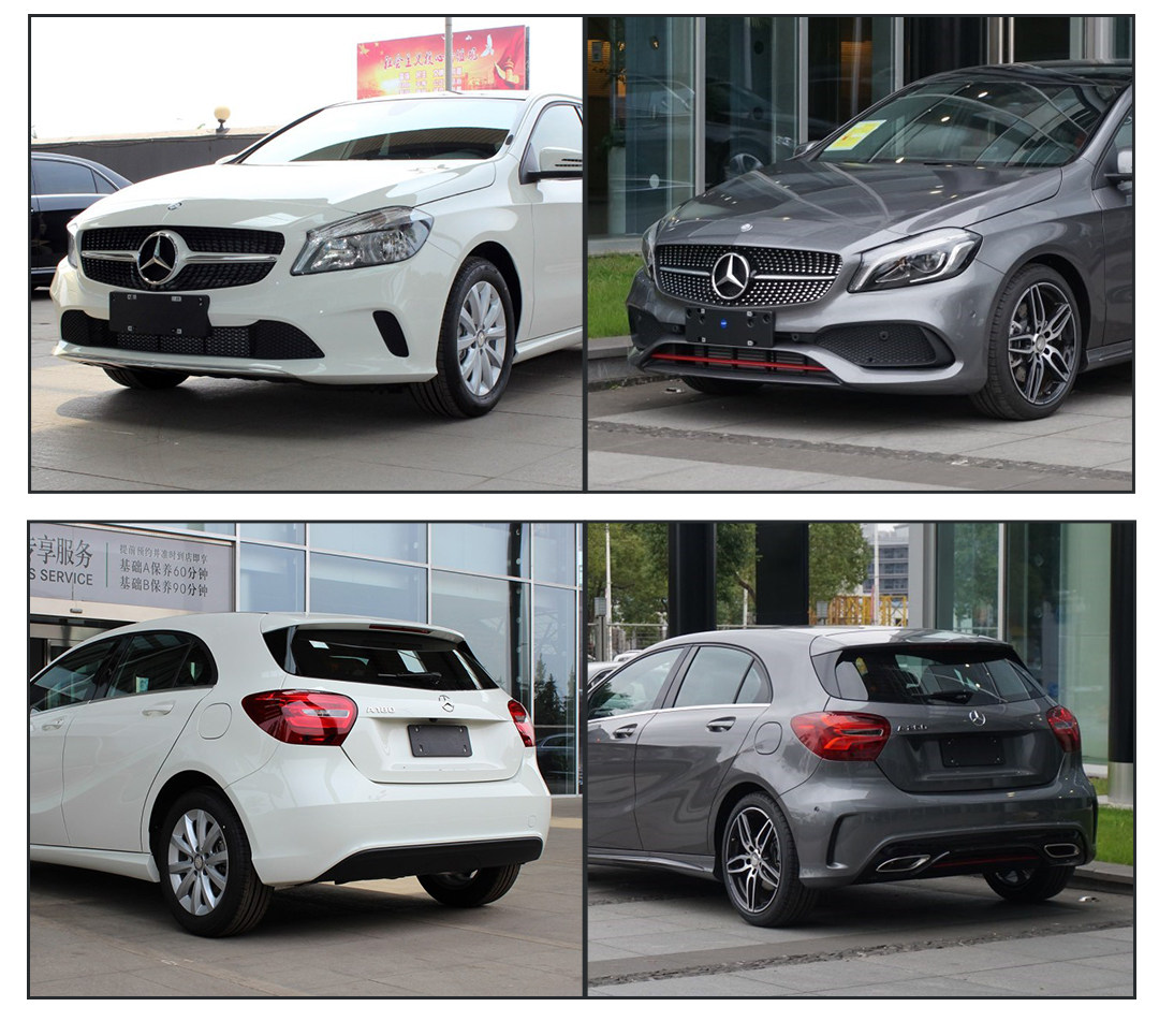 A级的外观高低配是两个风格,但是颜值差距不大,低配A180的是卤素大灯,外形偏时尚的前杠,轮毂形状比较普通,尾部没有露出排气管;而中高配则是LED远近光灯、运动包围,比较运动激进的前杠,两边共双出排气管,高低配是居家、运动两个风格,外观上,乞丐版的A180除了大灯不是LED,其他都没什么违和感。