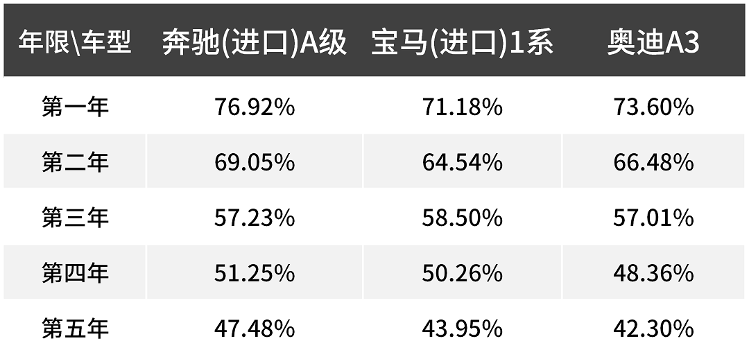 根据二手车之家数据,目前保值率最高的是奔驰A级,第二年仍然有接近7成的保值率,不过到了第五年几款车都不足50%保值率,市面上热销的紧凑车型有点不足,毕竟保有量不如其他车型大。