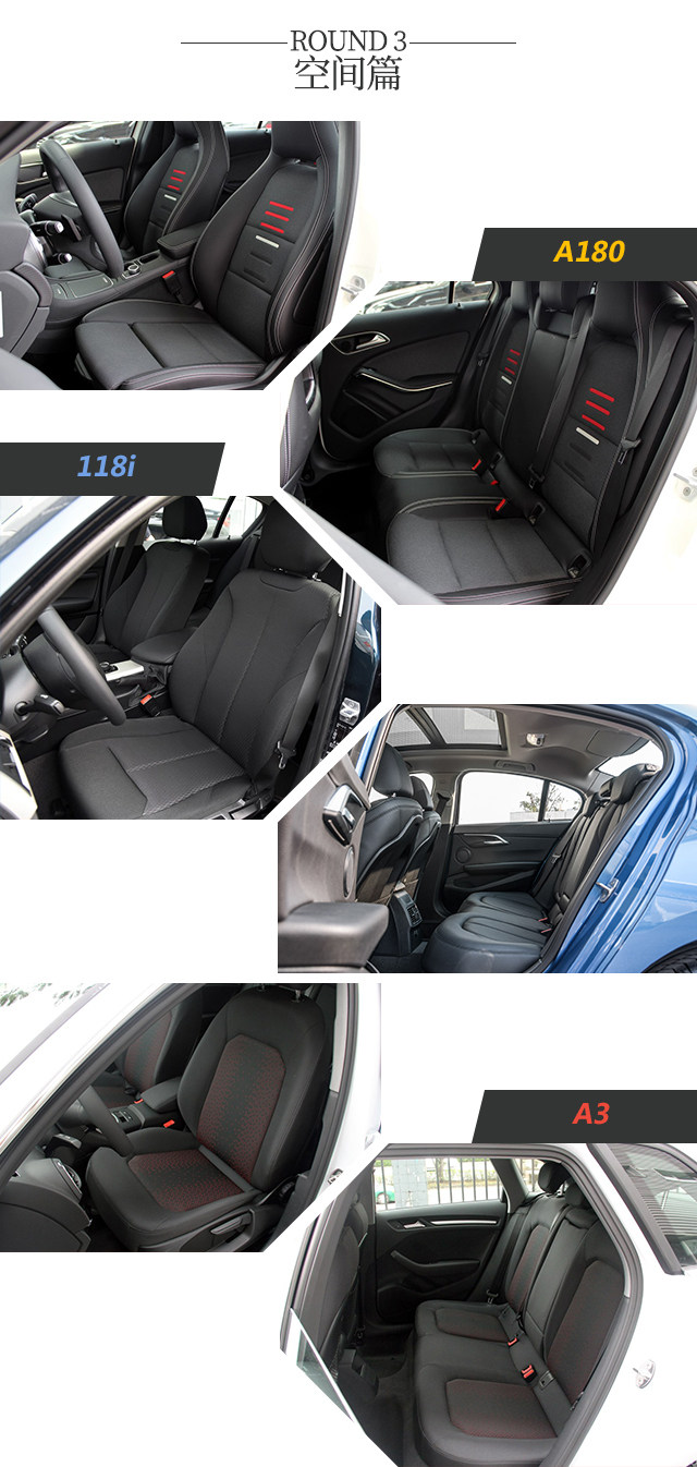 座椅空间方面,三者差不多,空间还算可以的有A180和奥迪A3,身高1米75左右的身材在后排有一拳左右的头部空间和一拳多点的腿部空间,而118i就更窄一点,值得一提的是A180的座椅设计在三款车当中最有运动感,乞丐版都有一体式头枕运动座椅,连后排都是这样的设计,还是皮/织混搭,值得点赞,另外两款都是织物材料。