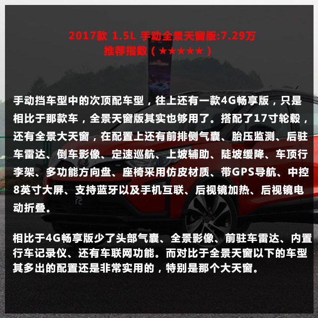 2017款 1.5L 手动全景天窗版:7.29万