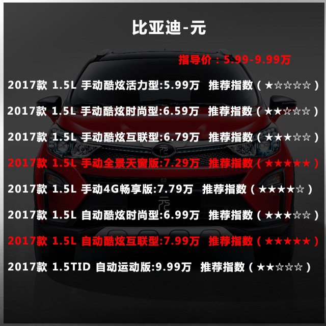 既然是推荐给老司机的车,那必须得上手挡车,尽情享受人车合一的感觉。元这款车共有五款手挡车型,那性价比最高无疑就是这个全景天窗版。天窗版打前的没天窗,直接pass,这么小的车要是没个天窗估计车内氛围会更加压抑。而所谓的4G畅享版,也没啥可圈可点的地方,还要贵上那么五千块钱,不实惠。
