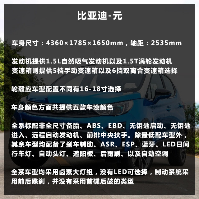 元之所以能有那么充裕的空间得益于其较大的车身尺寸,全系除了顶配车型搭载1.5T涡轮增压发动机外(最大功率154匹马力),其余车型均搭载1.5L自然吸气发动机(最大功率109匹马力)。全系标配无钥匙进入以及无钥匙启动这点的确让人感到惊讶,毕竟很多豪华车上都得选装这玩意。除了丐中丐版外,该有的安全配置也有了,甚至连自动空调都出现了。