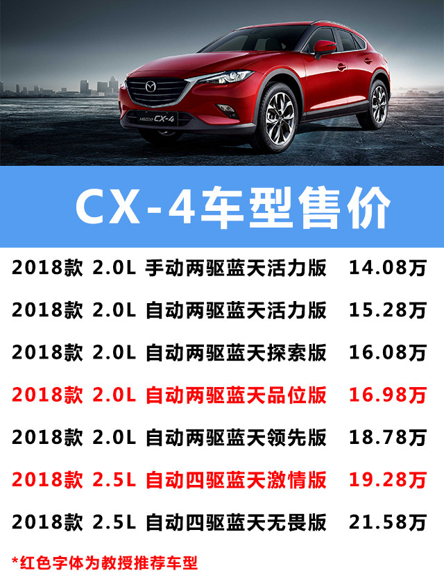2018款马自达CX-4全系共有7款车型可供选择,教授最为推荐购买的车型是2.0L的蓝天品位版以及2.5L的蓝天激情版。