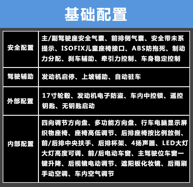 基础配置是全系唯一的手动档车型蓝天活力版的配置。全系都标配无钥匙启动这个有点意外。